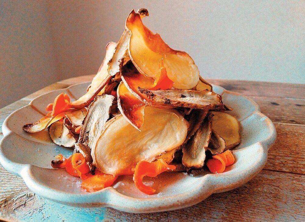 ちょびっとだけ残った根菜を薄く切り、オーブントースターの天板に並べてチーン。カリッとするまで8~10分加熱したら、塩をふっていただきます。子どもたちが大好きな一皿で、毎回あっという間にお皿がからっぽになっちゃいます(笑)。