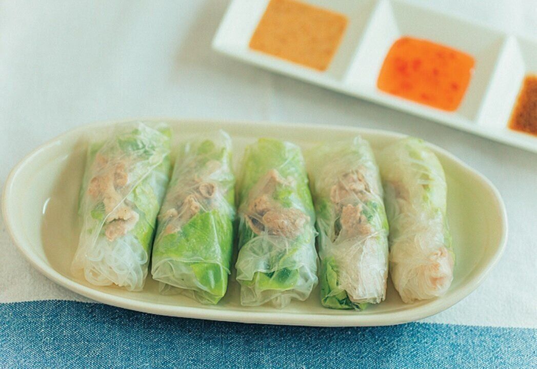 葉もの野菜やきゅうりが半端に残ったら、うちでは生春巻きにするのが定番。ゆでた春雨やえびを一緒に巻けば、りっぱな一品に。生春巻きの皮は、業務スーパー®で安くゲットして常備。