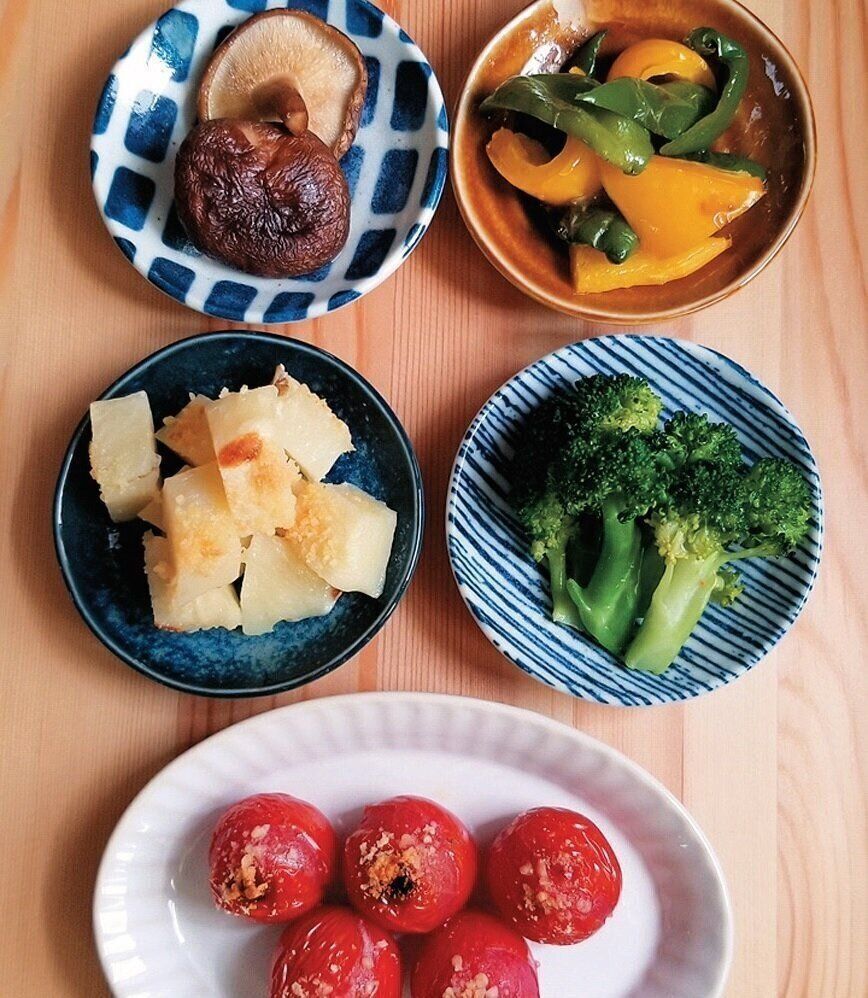 食べやすい大きさに切った野菜に、オリーブ油と塩をふり、グリルで焼くだけ。野菜別に盛りつけたら、お店みたい!