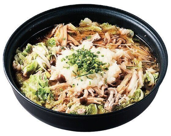 鍋に白菜と豚バラ肉の薄切りを交互に重ねて敷き詰め、きのこ類もトッピング。しょうゆベースの和風だしか市販の鍋スープで煮るだけ。大根おろしとねぎもたっぷりと!