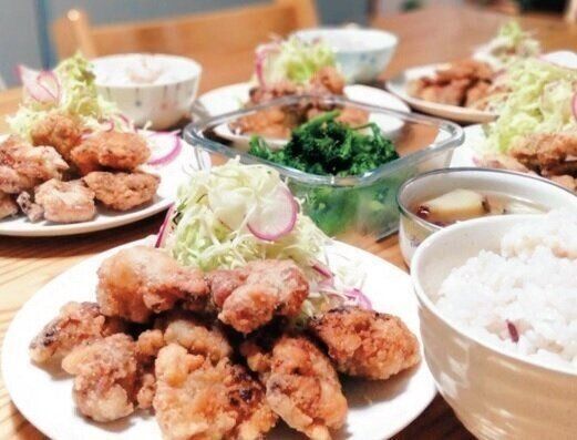 鶏肉は漬けておき、帰ってから揚げるだけ。野菜も切ったり煮たりしておいた物を出すだけだから実は時短!
