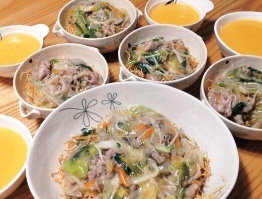 残り野菜と肉であんかけ炒めを作って、皿うどんに。冷凍しておいたかぼちゃペーストは、豆乳でのばしてスープに。