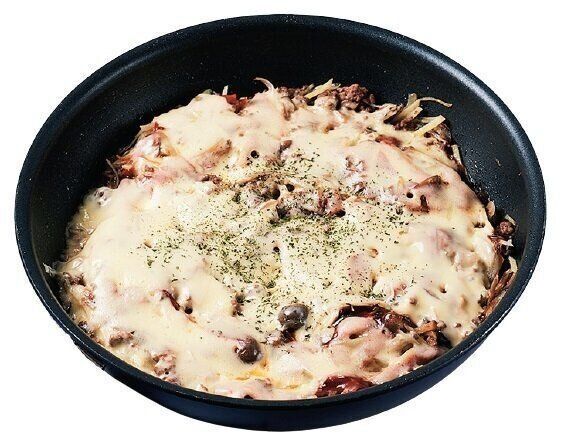 合いびき肉を炒め、せん切りのじゃがいもと玉ねぎ、きのこを加えてさらに炒め、塩、こしょうをふり、ケチャップとソースで味つけ。最後にピザ用チーズをのせて、溶けたら完成。