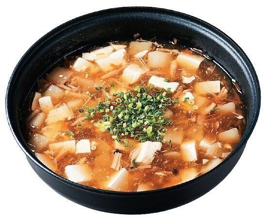 大根、にんじん、いもなどの根菜をしょうゆ、みりん、砂糖で味つけしただし汁で煮て、きのこを加えてひと煮立ち。片栗粉でとろみをつけて、最後に豆腐を入れてさっと煮る。