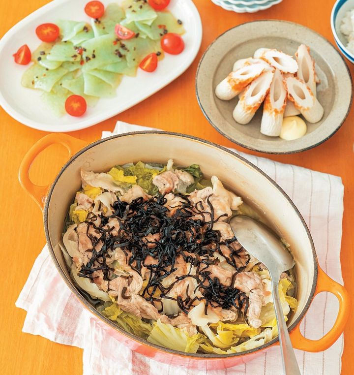 安くて重量感がある白菜は、豚肉と煮るだけでボリュームおかずに。「白菜と豚肉の代わりにキャベツとツナを使ってもいいので、毎週作っても飽きません!」。鍋ごと出せば豪華に見えるし、汁ものを作らなくていいのも助かる!