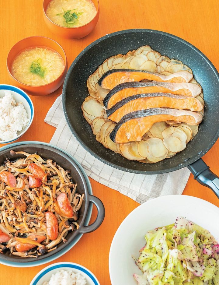 月曜日は、いたみやすい魚の日。「1パック4切れ入りの鮭は、1人1切れなくてもよしとし、パパ以外の4人で3切れを食べます。じゃがいもでかさ増しするから、しょんぼり感はなし!」。サブの炒めものは、ウインナーで肉感を出して節約感はゼロ。