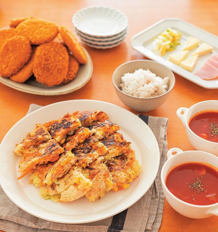 金曜日は冷蔵庫の在庫食材の一掃デー。「半端に残った肉や野菜を刻んで、チヂミにします。薄力粉と混ぜて焼けばボリュームが出て、腹ペコ兄弟達にも大好評!サブは、特売で買ったコロッケや調理ずみの副菜を大大活用して、お疲れMAXの金曜を乗り切ります!」。