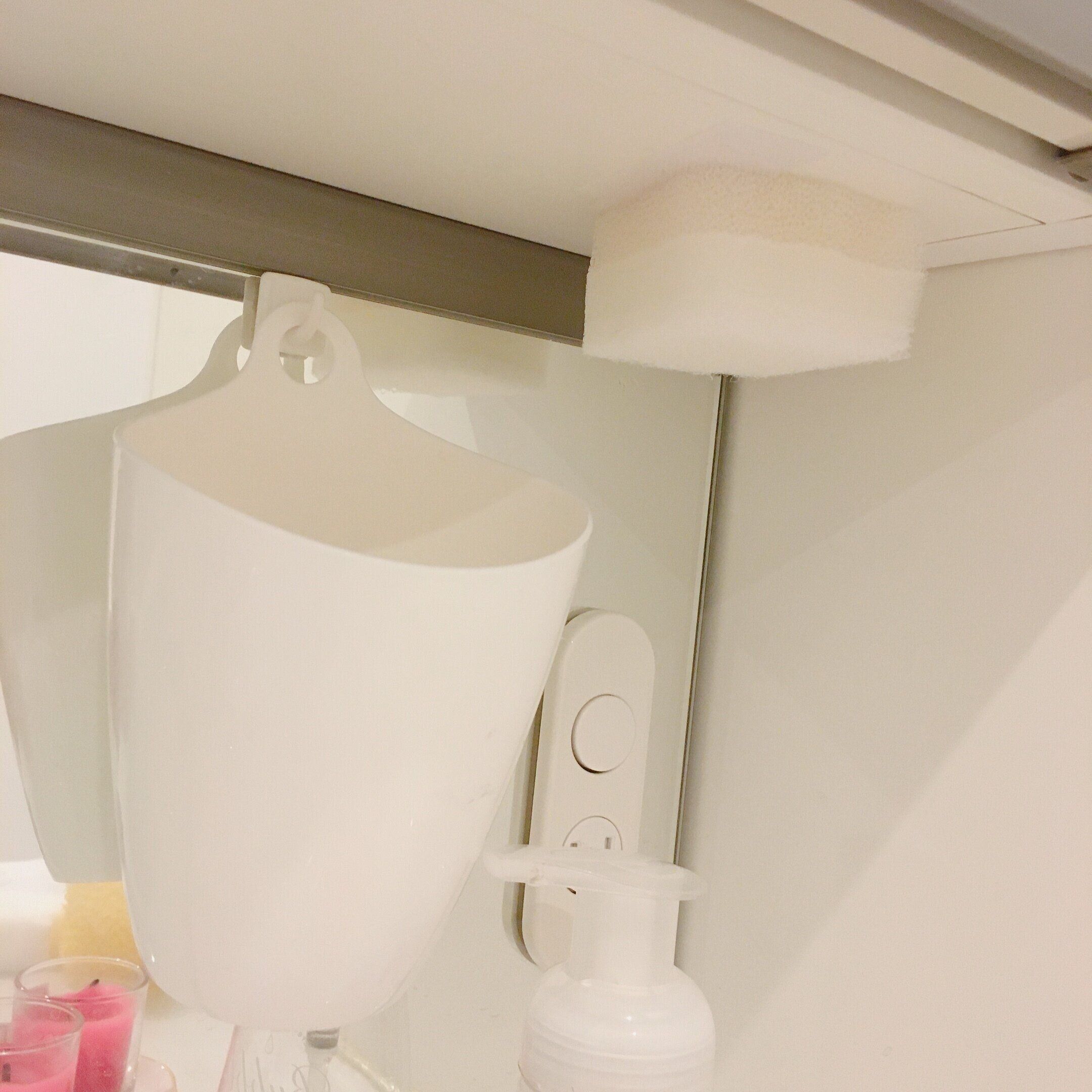 掃除用のスポンジを洗面所のすぐ取れる場所に置いています。スポンジはマジックテープのザラザラした面を洗面所の目立たないところに貼りつけてそこにペタッとするだけ。スポンジがすぐ手に取れてすぐに戻せると少し汚れが気になった時にササッとできるのが本当に楽です。