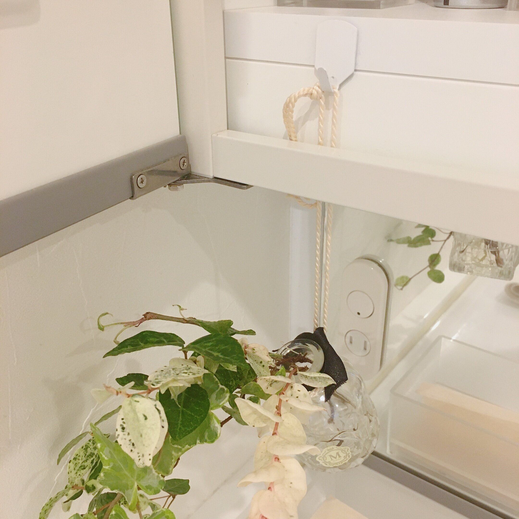 でも癒しの空間にしたい!そんな時は吊るしてみましょう。我が家ではグリーンを吊るしています。鏡の裏側の見えないところにフックを付けました。紐をつけた小さな花瓶に庭のグリーンを切って挿して引っ掛けるだけ。簡単にできました。