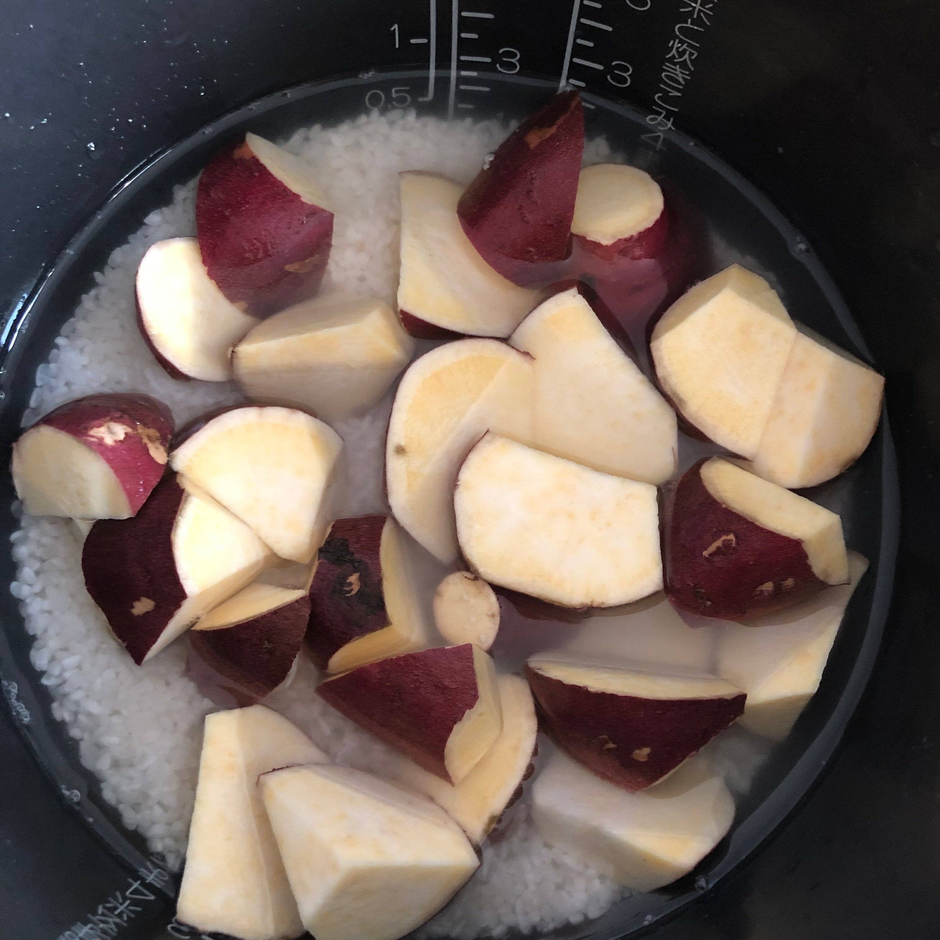 その後、炊飯器の2合のメモリに合わせ水を入れたら、水気を切ったさつまいもを上にのせます。