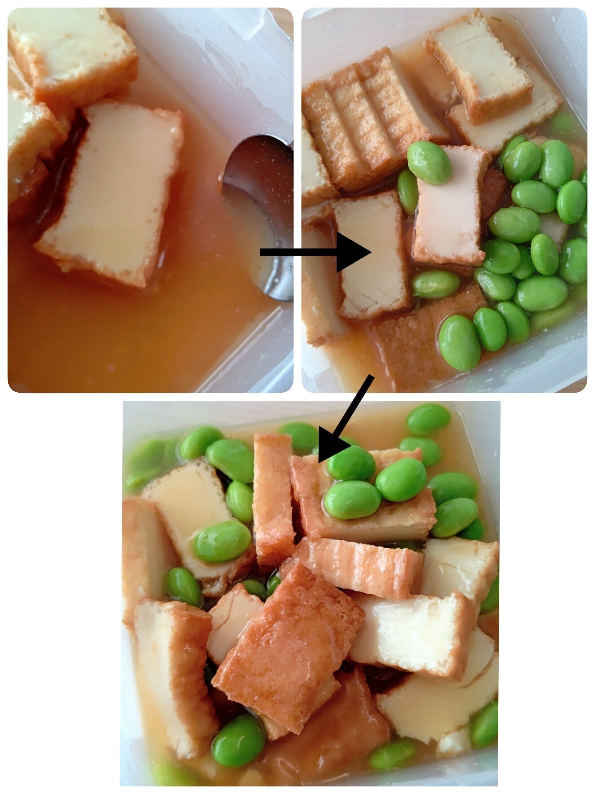 厚揚げとめんつゆをレンジでチンして水溶き片栗粉でトロミをつけて枝豆を混ぜるだけ。