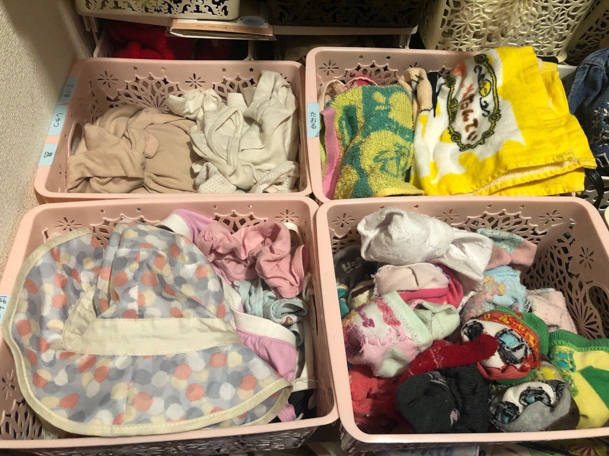 実は以前からカゴ収納はしていたのですが、やっぱりキレイにたたんで入れないとすぐにグチャグチャに溢れてしまいイライラしていました。