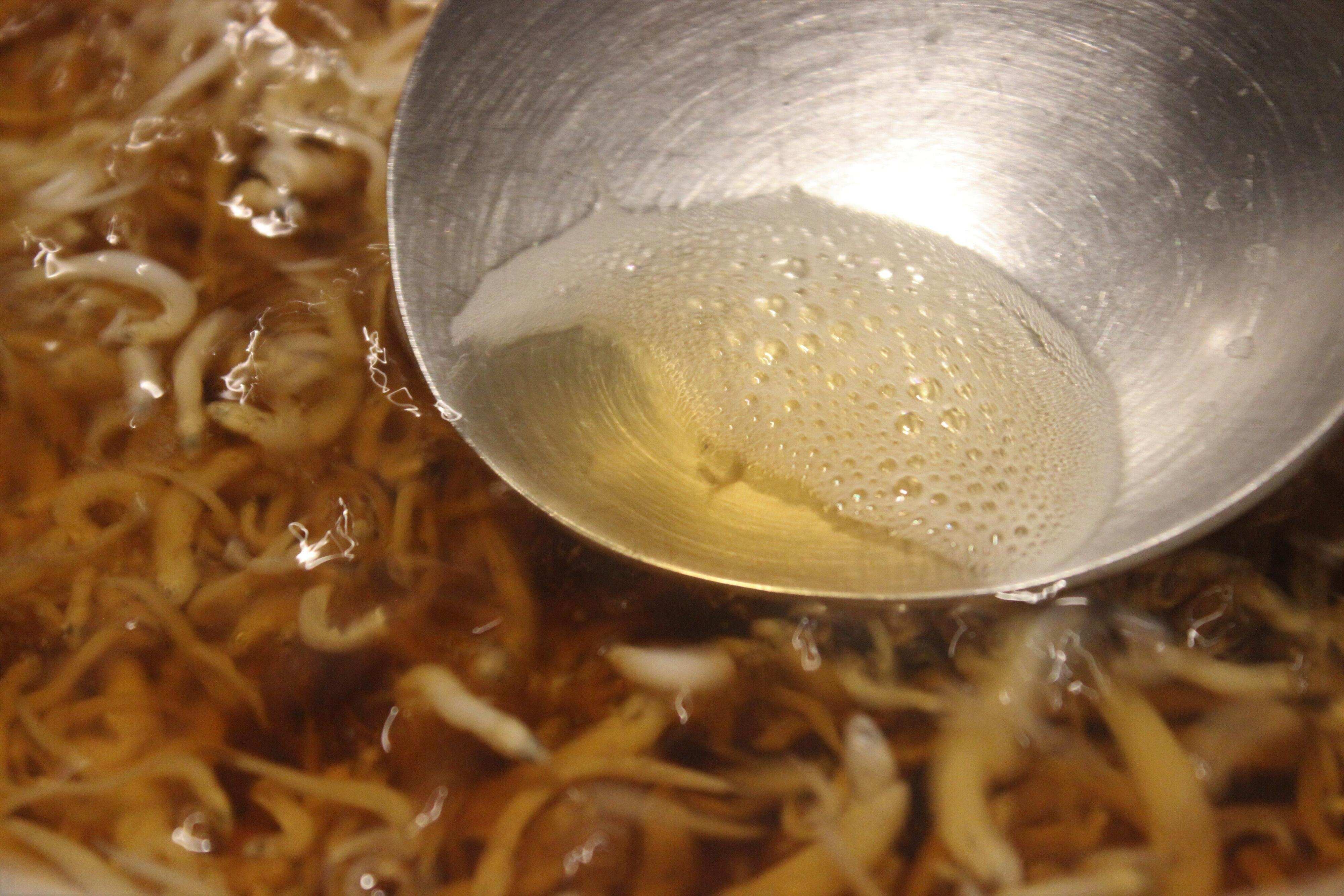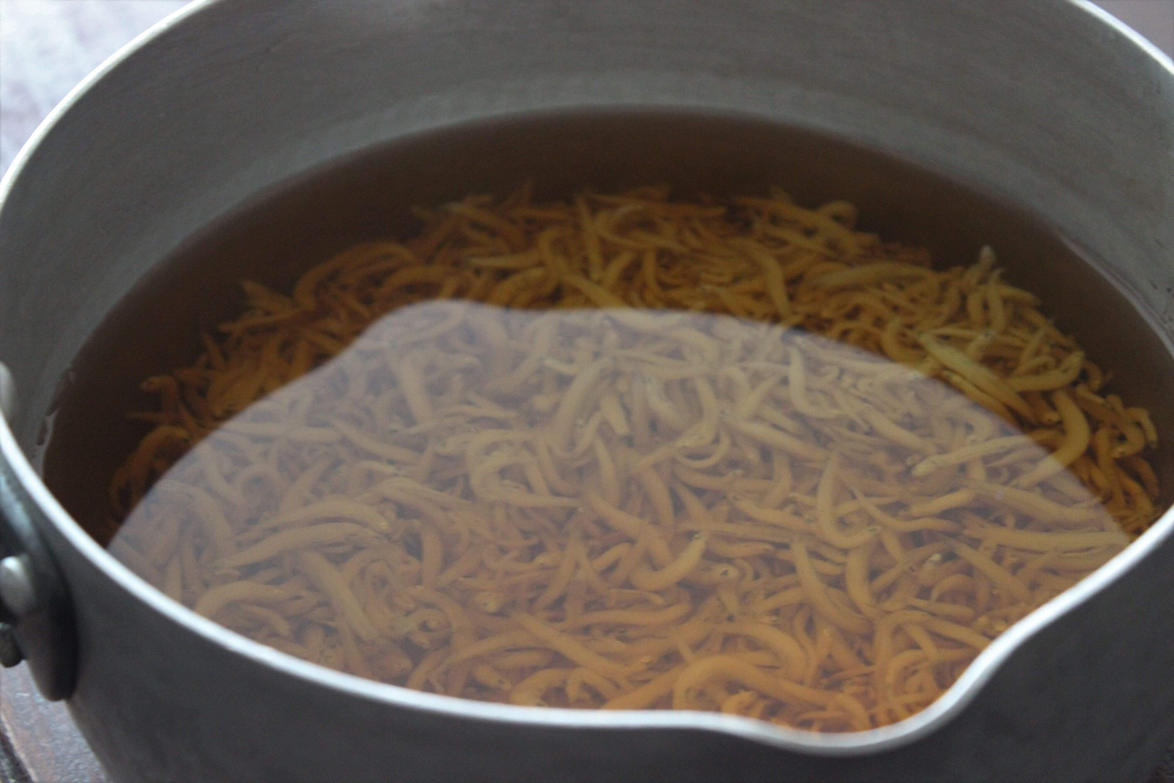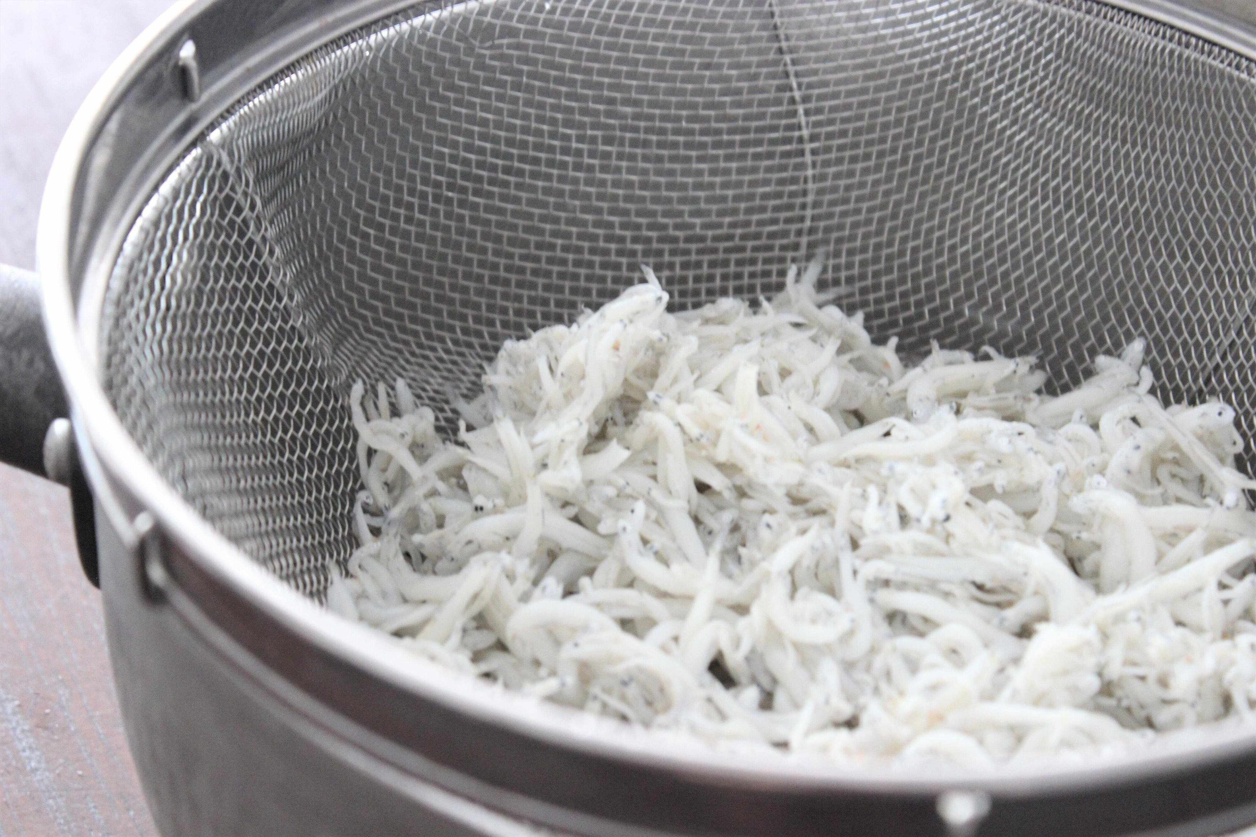 1.ちりめんじゃこを6時間程度水(分量外)に浸し、途中何度か水をかえながら塩気を抜く。