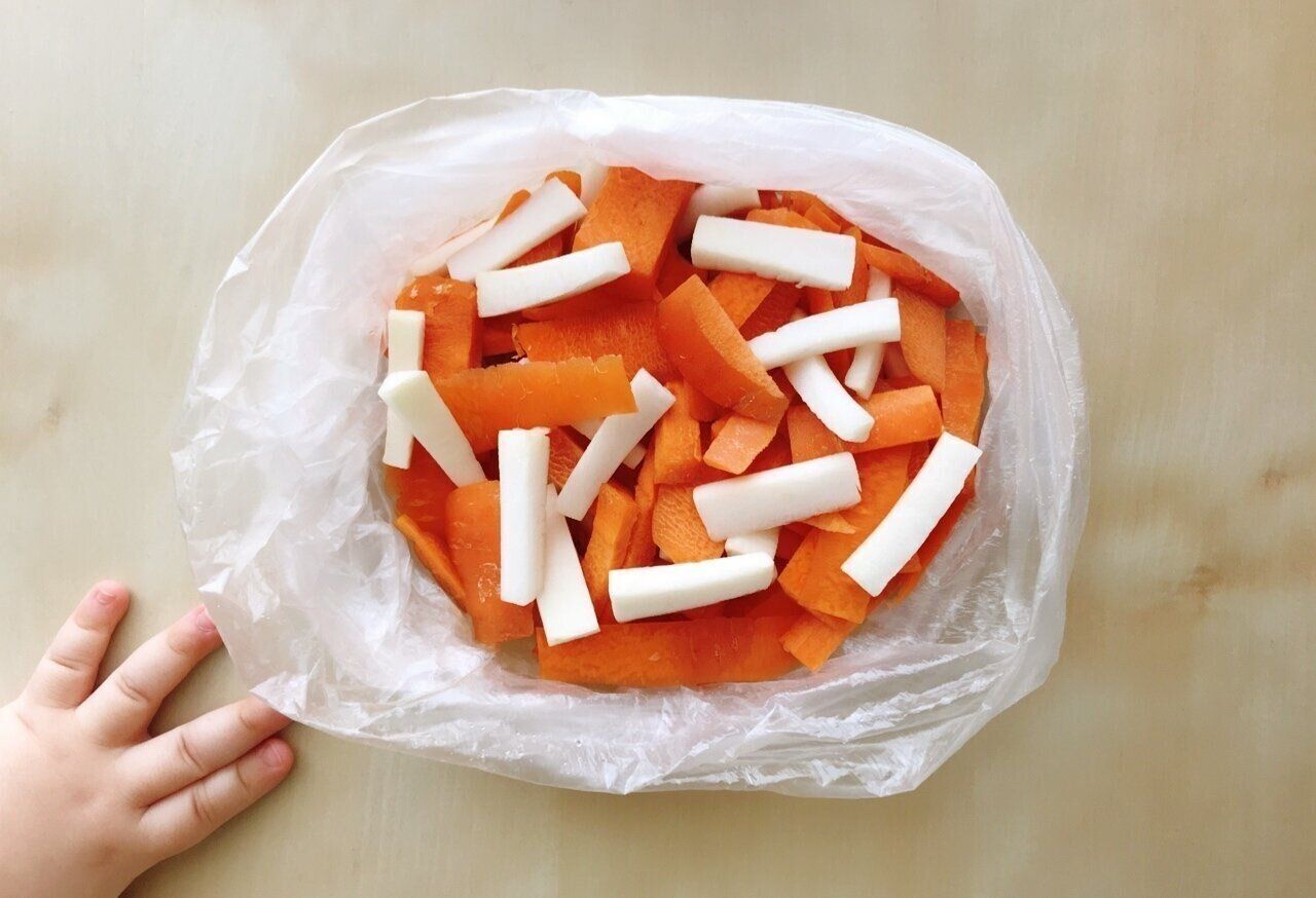 人参や大根のむいた皮は、このような感じでポリ袋に一時的にまとめておきます。1回で溜まることもあれば、2回分くらいまとめることもあります。