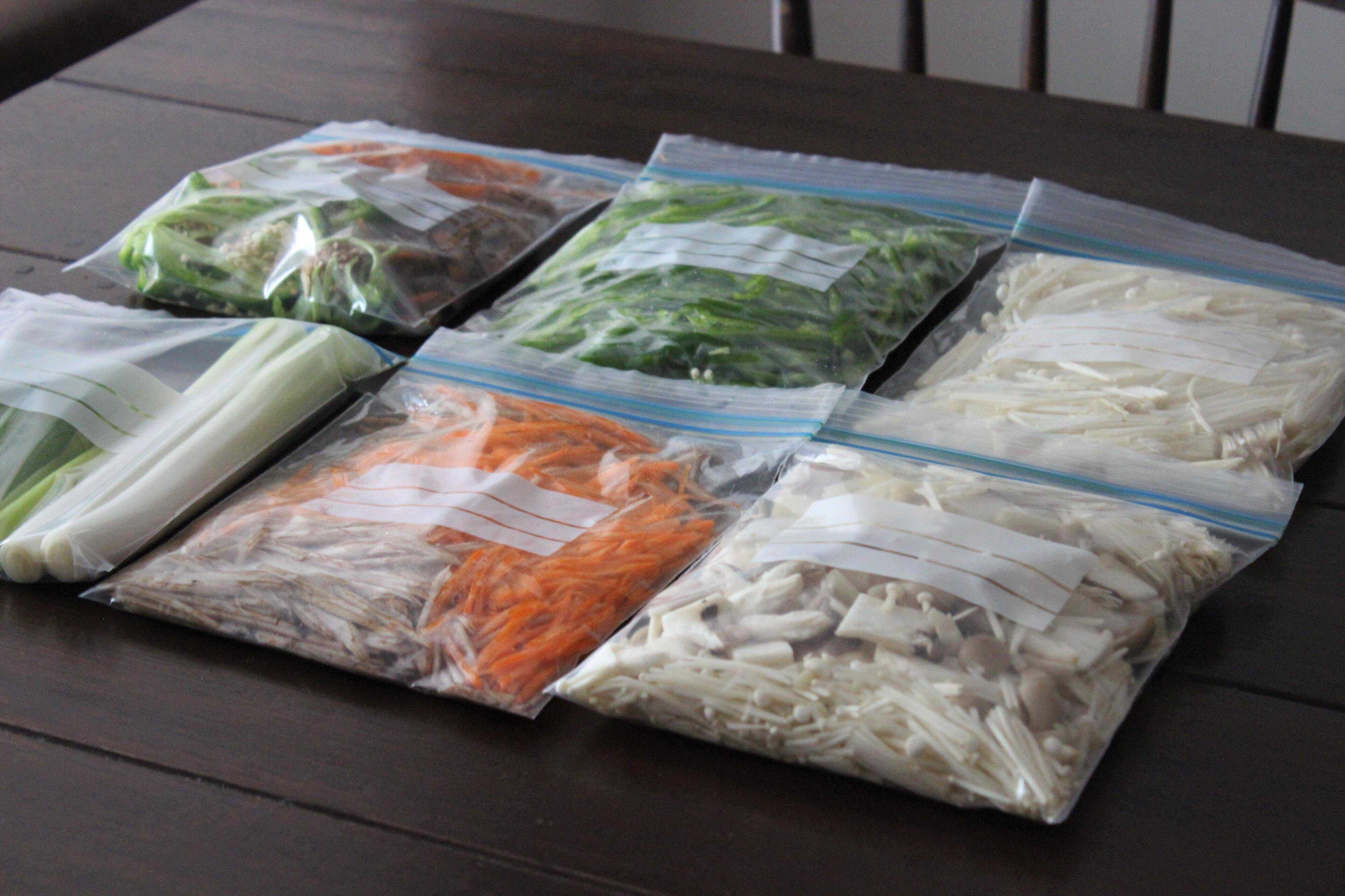 にんじんとごぼうは、必要であれば皮をむいて千切りにし、ジッパーつき保存袋に平たく広げて冷凍保存しています。皮は野菜だしを作るのに使えるので、ほかの野菜くずといっしょに冷凍保存します。