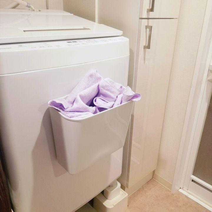 タオルは洗濯機前のボックスに一時置きします。下着や靴下も畳まずボックスにぽいぽい収納でOK。下着や靴下はゆとりを持たせた収納なので、意外とシワになりません。