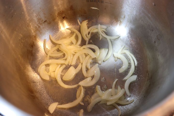 4.3に水、コンソメを入れて、野菜が柔らかくなるまで蓋をして弱火で10~15分煮込む。(圧力鍋なら加圧してから弱火で5分)