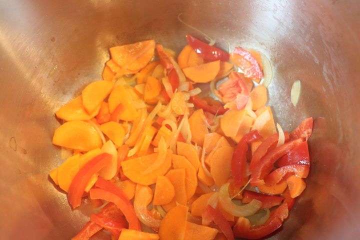 3.2の鍋ににんじん、パプリカを入れて、炒める。