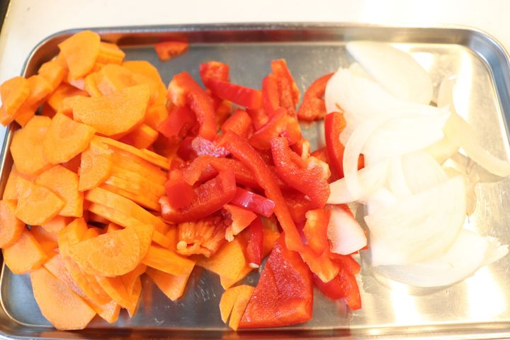 1.にんじんは皮をむき、パプリカは種を取って、それぞれ薄切りにする。玉ねぎも薄切りに。