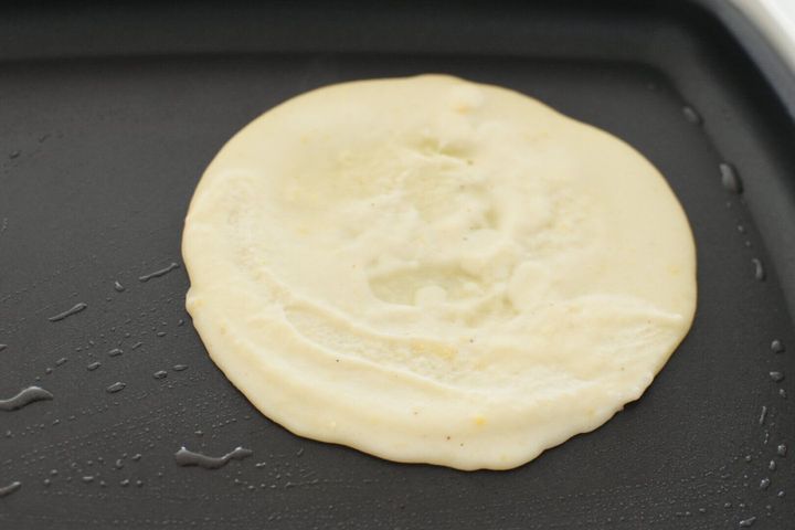 生地を薄く伸びしていきます。片面が焼けたらキャベツをたっぷり乗せていきます。