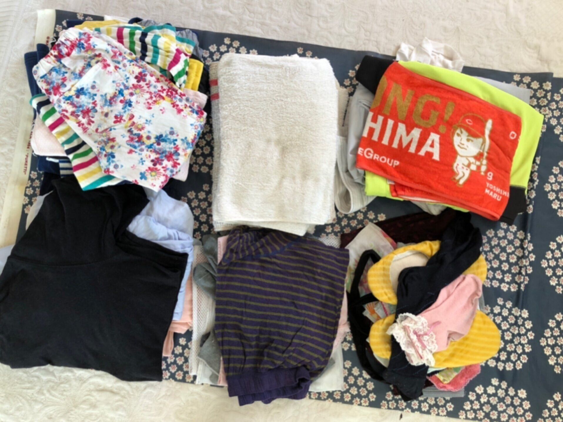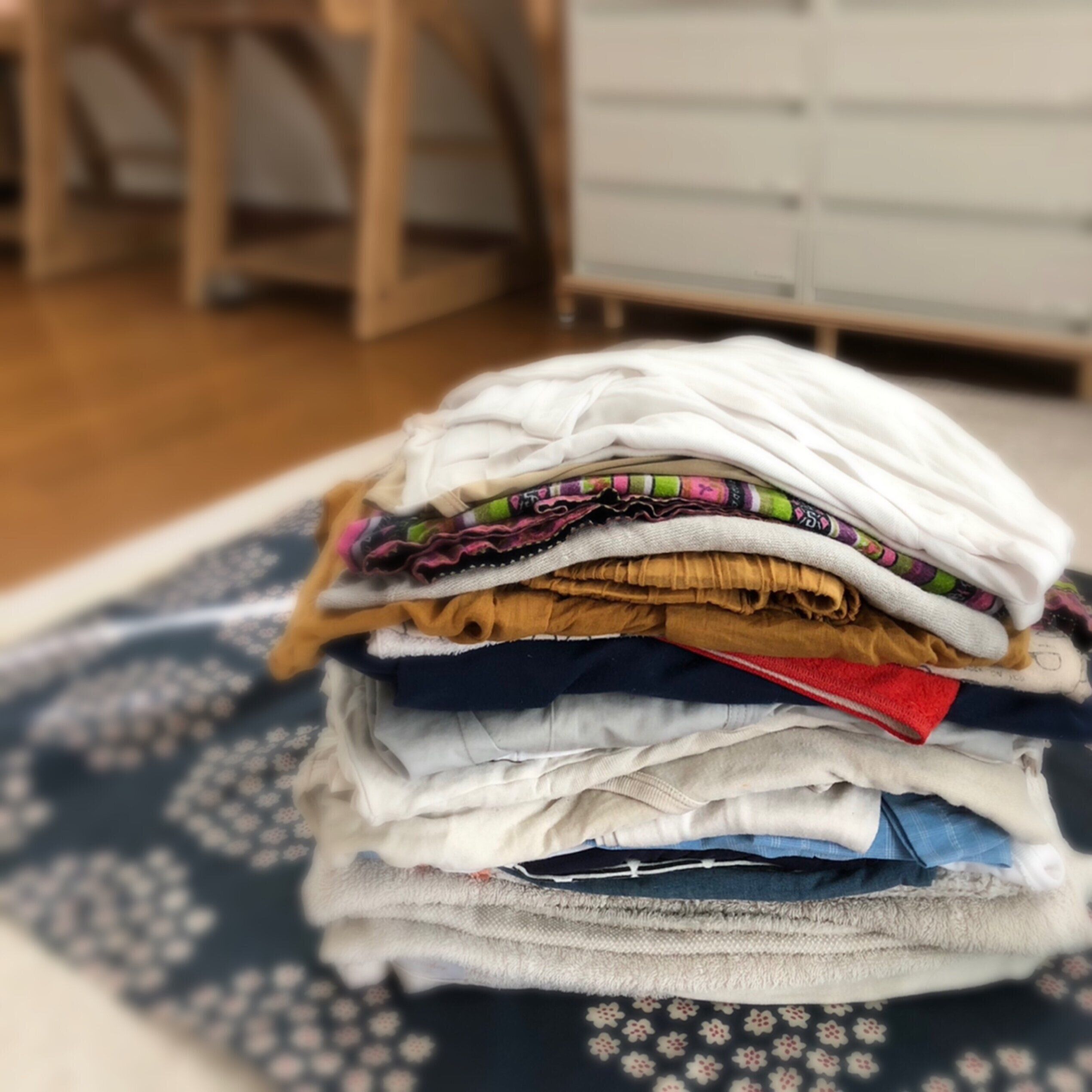 ここで既にポイントですが(笑)、四つ折り程度に畳んで重ねてゆきます。重ねることが重要です。重ねることで自身の重みでしわがほぼ伸びます。パンパンと軽く伸ばして畳めばOKです。私は人別に干すので、私と主人、娘たち、父母、タオル、小物、と分けていきます。