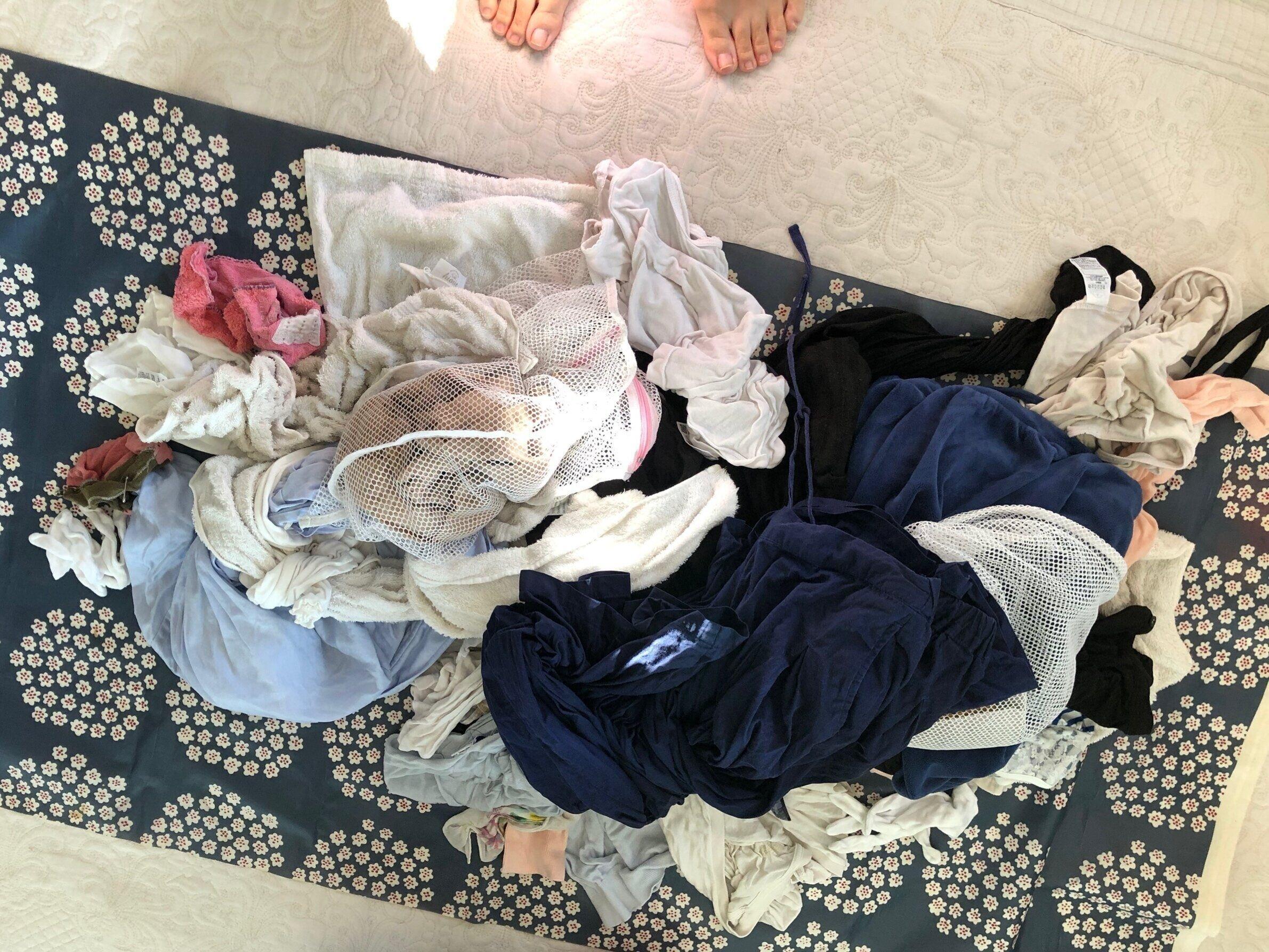 最終的にこの状態で、次の干す作業がし易いように全て重ねてしまいます。これでほぼほぼしわは伸びてしまいます。我が家でアイロンをかけるのは、主人のカッターシャツとハンカチのみです。「あ、それはかけるのね。」と思った方、そこはかけましょう(笑)。