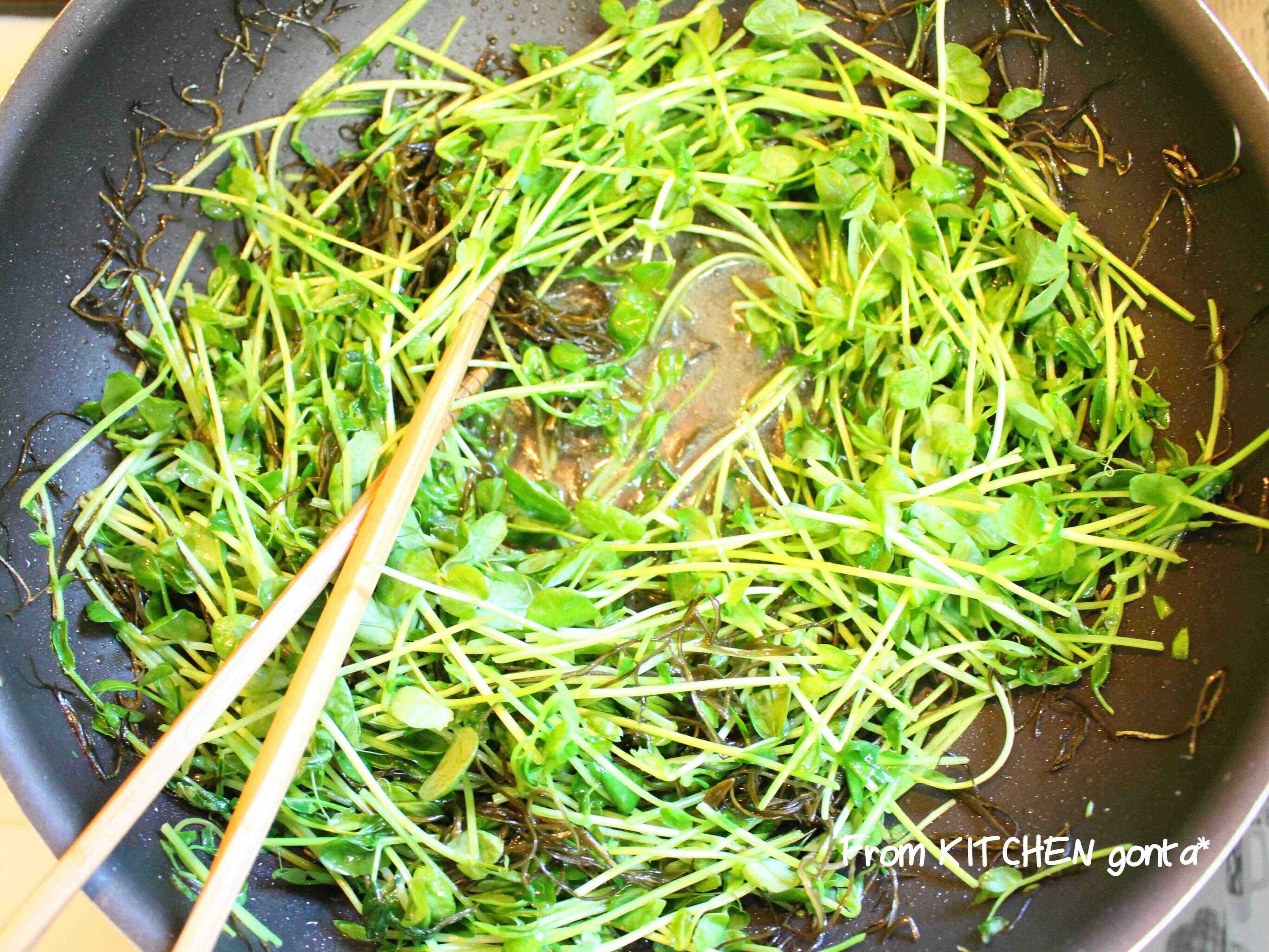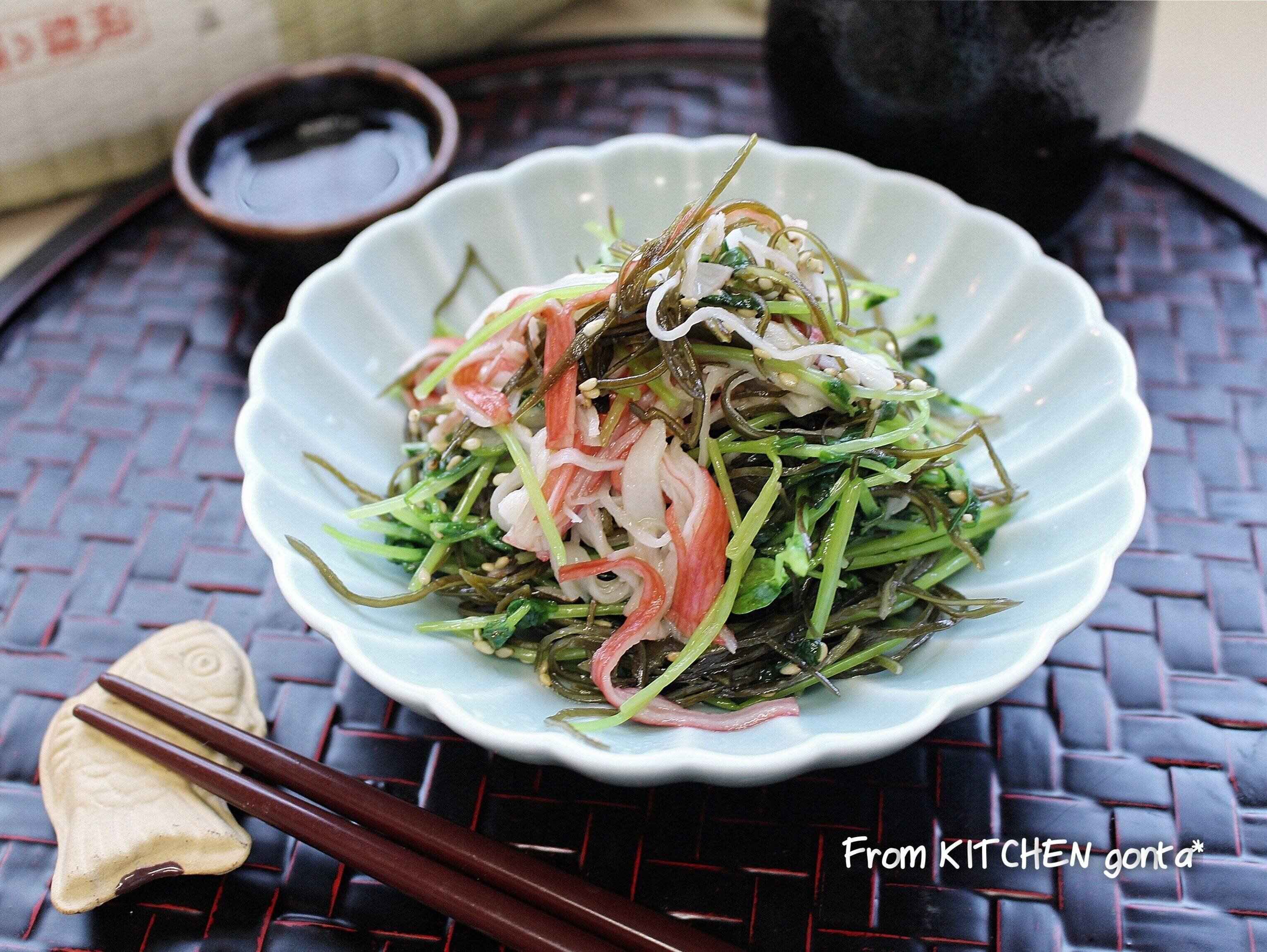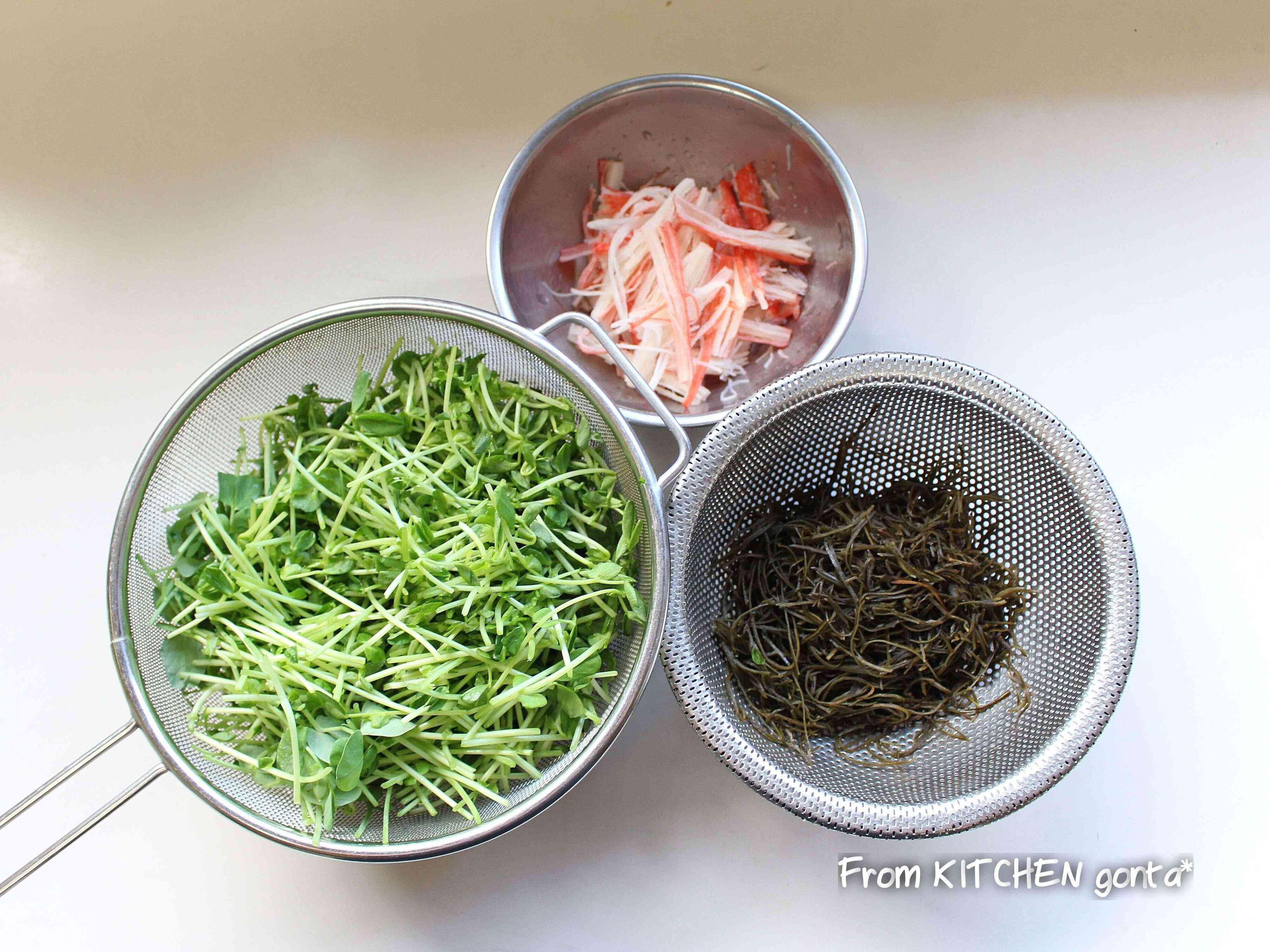 (1)豆苗の根を切り落とし、2等分に切る。細切り昆布をひたひたに水に2分つけ、戻しておく。カニカマを割いておく。