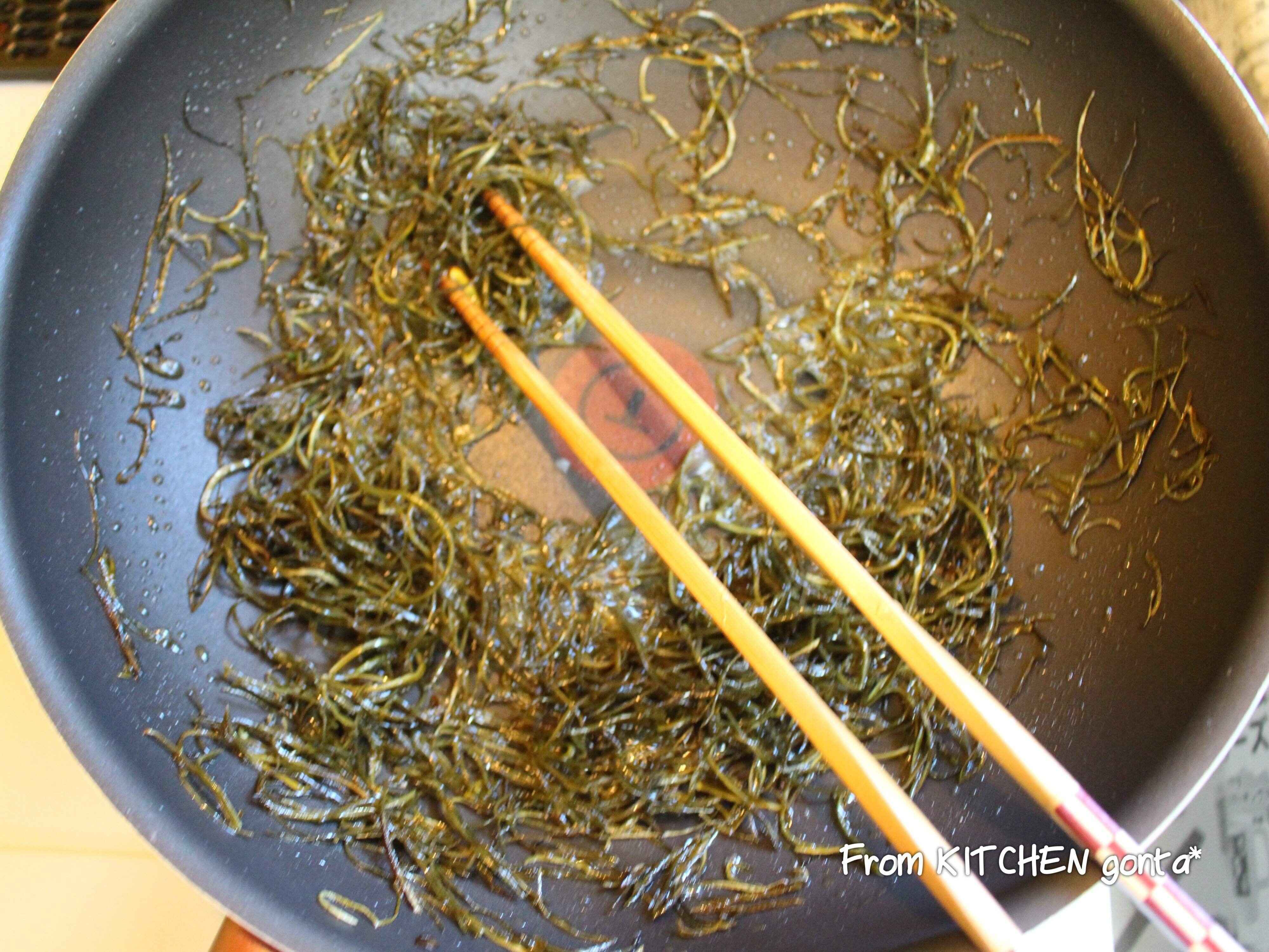 (2)フライパンに胡麻油を入れて中火から、やや強火で熱し、細切り昆布を炒める。