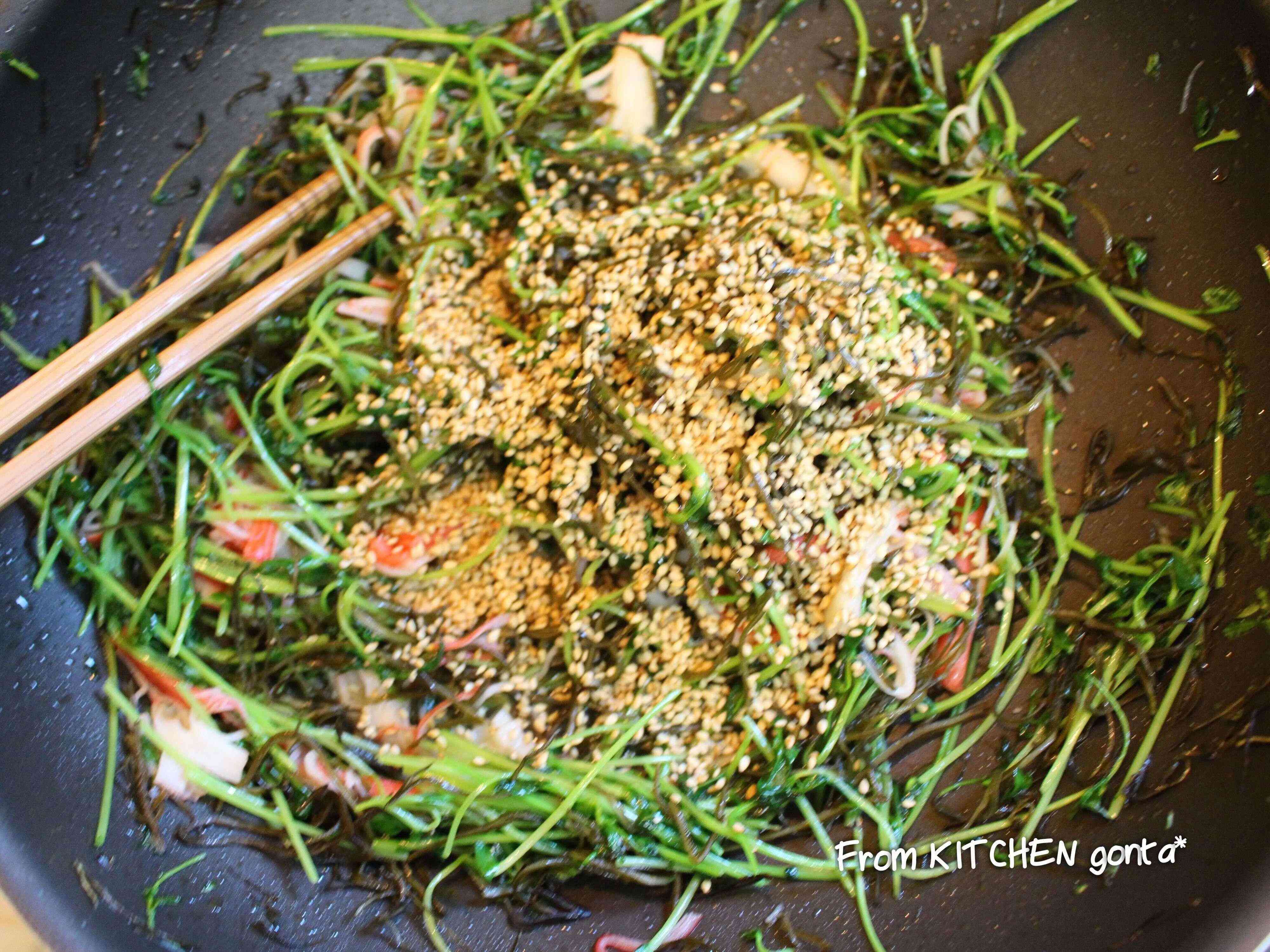 (4)火を止めて、仕上げのカニカマと炒りごまを加えて、混ぜれば完成!