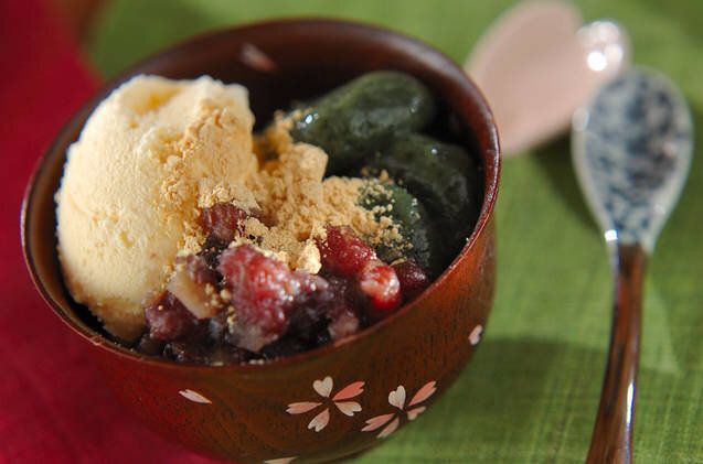 よもぎでつくった白玉を加えたぜんざい風のレシピです。バニラアイスや小豆、きな粉を添えて食べる、よもぎの香りが広がる贅沢な一品です。