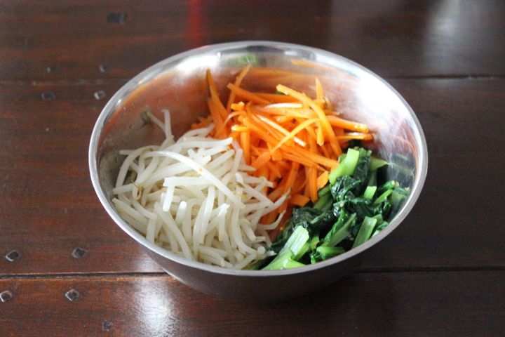 にんじん、小松菜、もやしをそれぞれさっと加熱して、胡麻油、塩、白すりごまで和えておく、というものです。