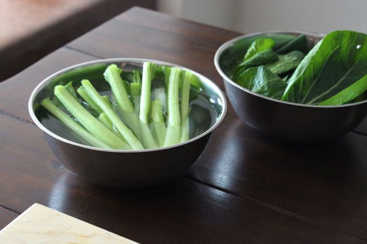 青菜は葉と茎に分けて加熱するとおいしさが増しますが、余裕がない時はざばーーーっと茹でてしまえば良いと思います。