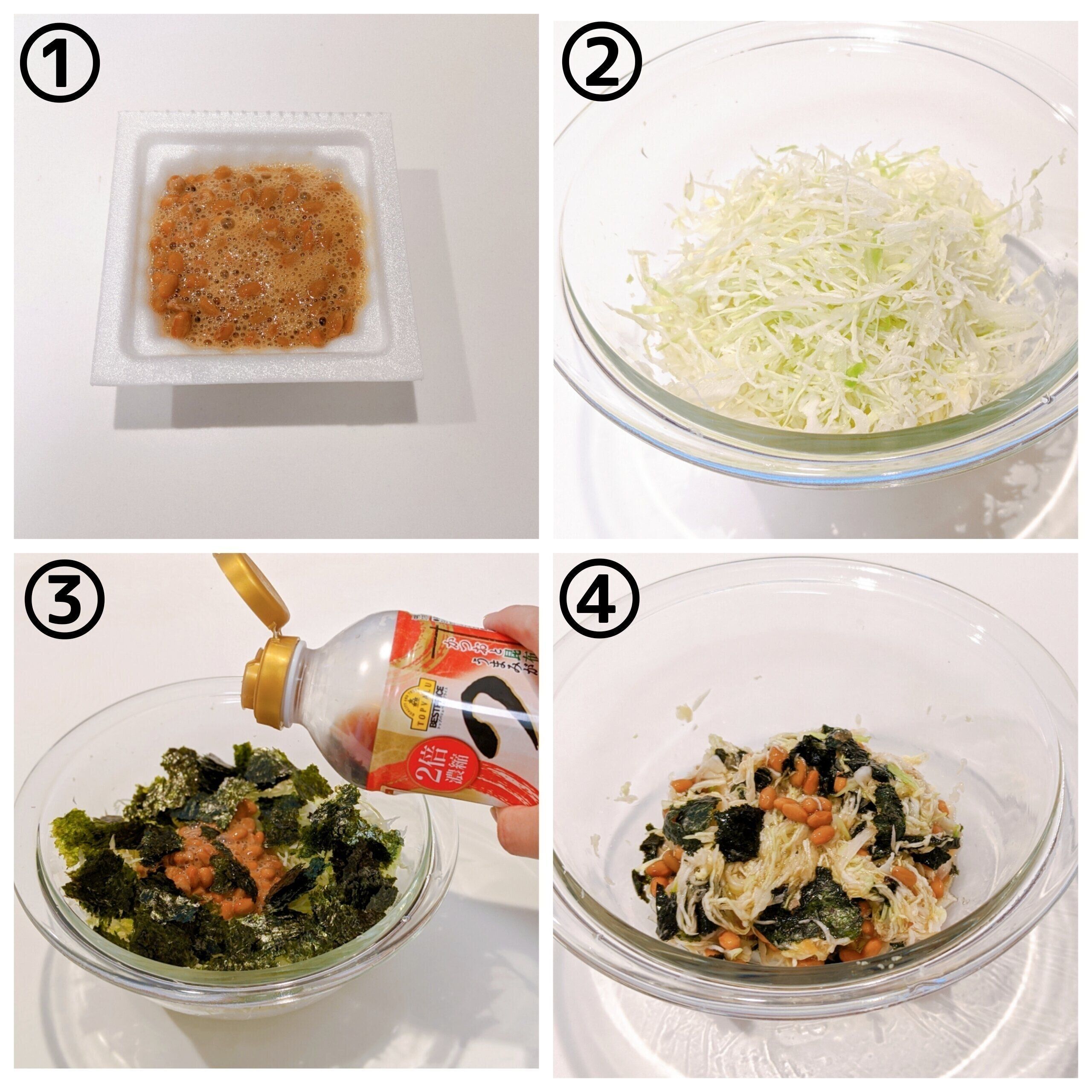3、納豆、キャベツ、ちぎった海苔を混ぜ、めんつゆを回しかける。