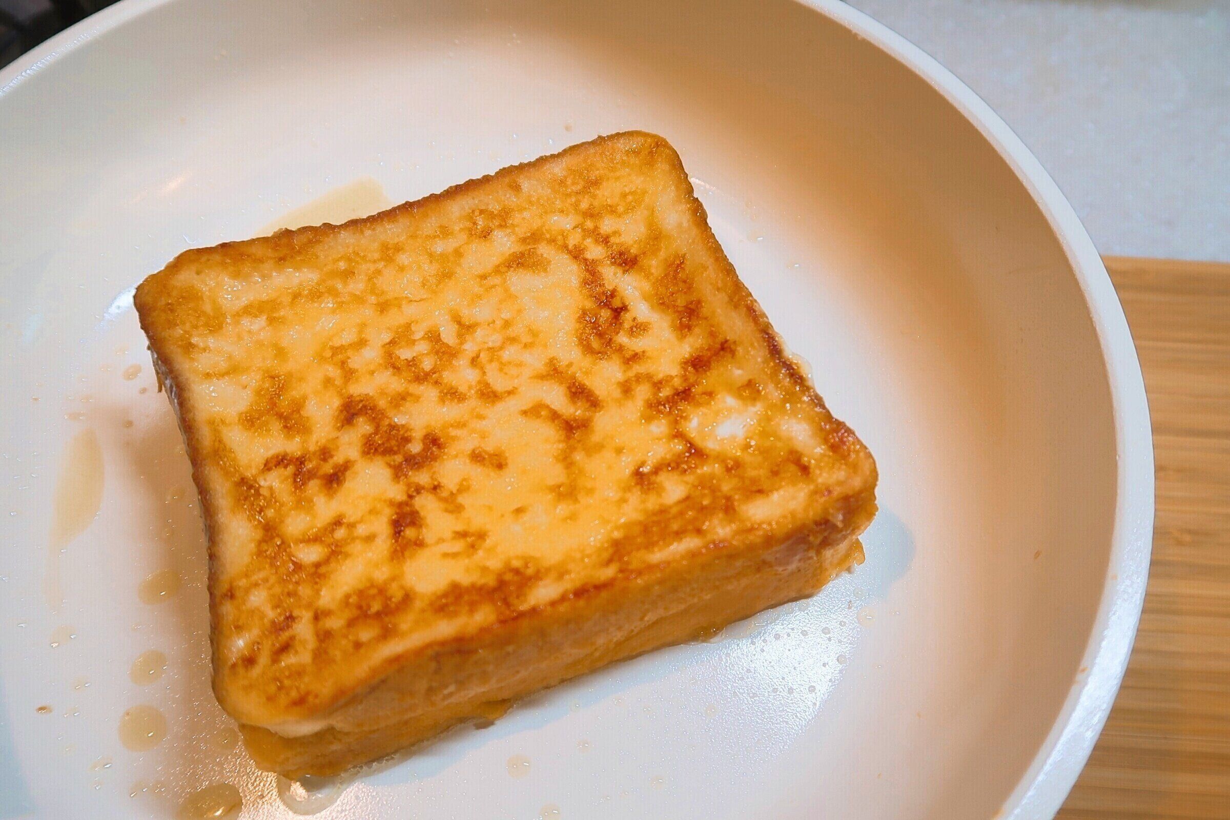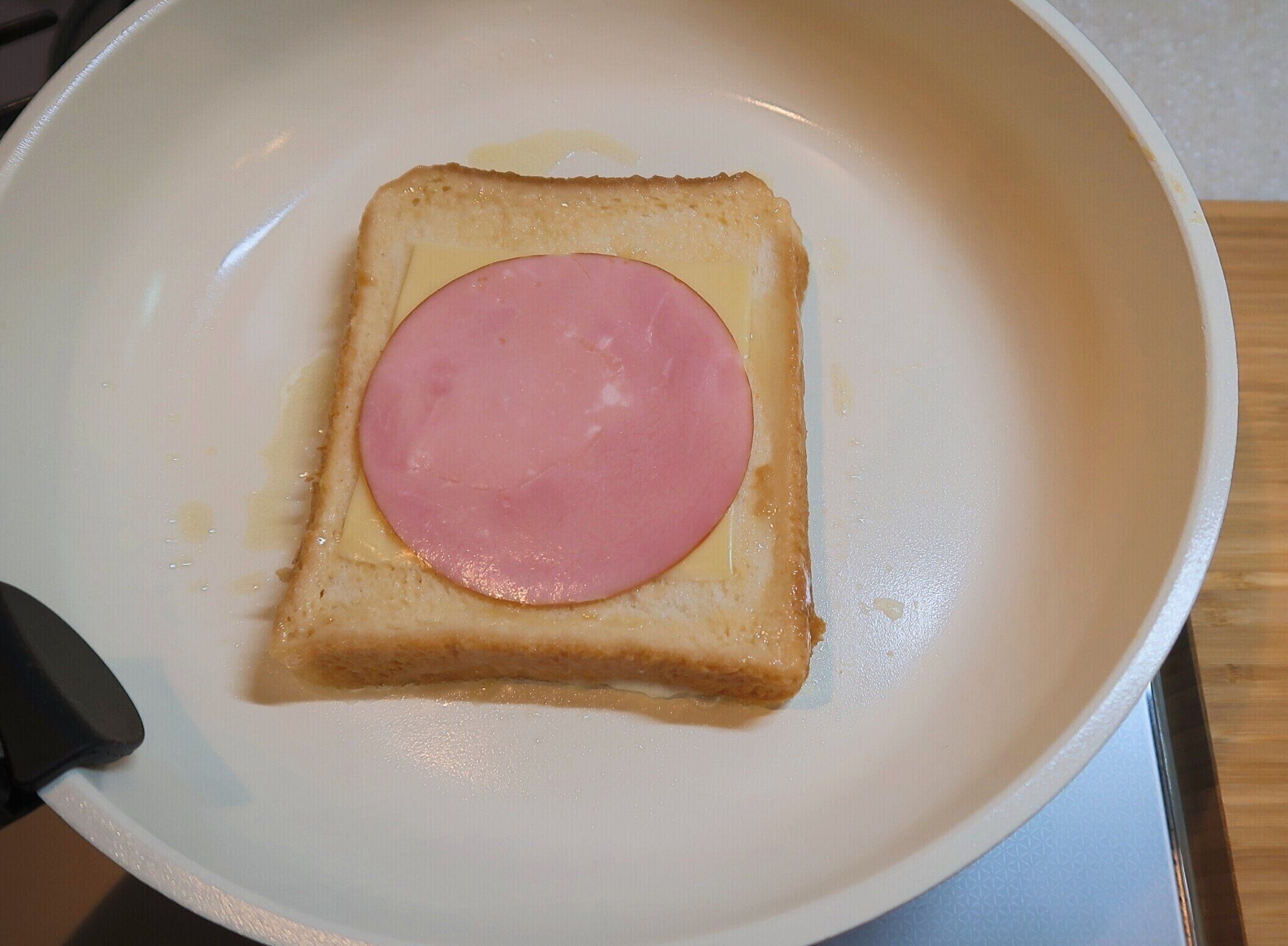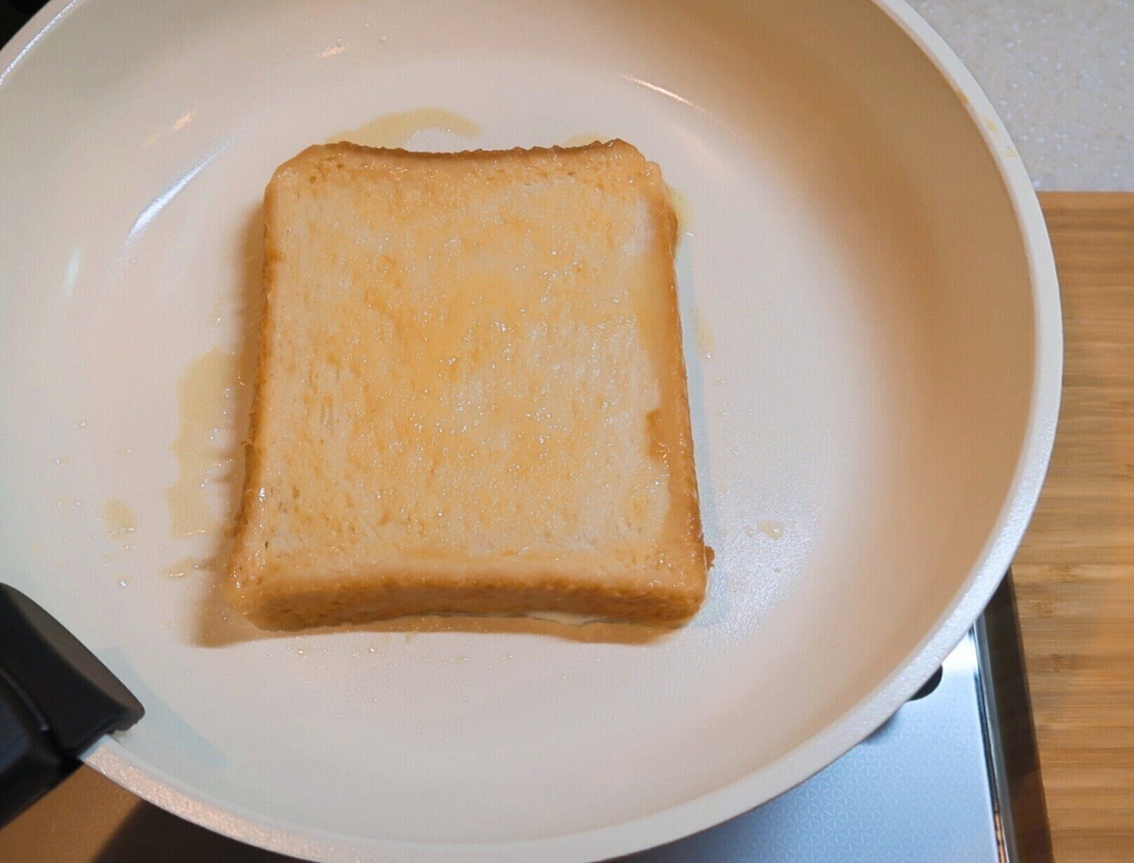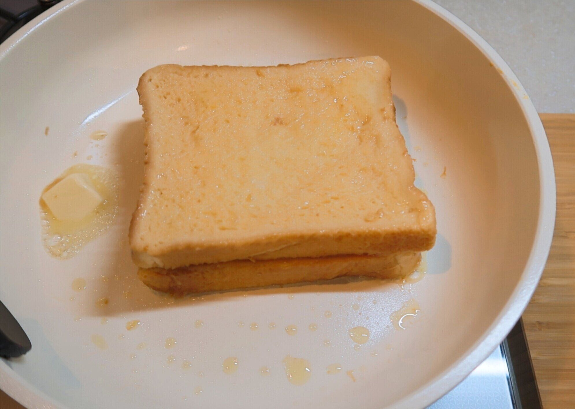 裏面にこんがり焼き色がついたら、もう1枚の卵液につけた食パンを重ねます。