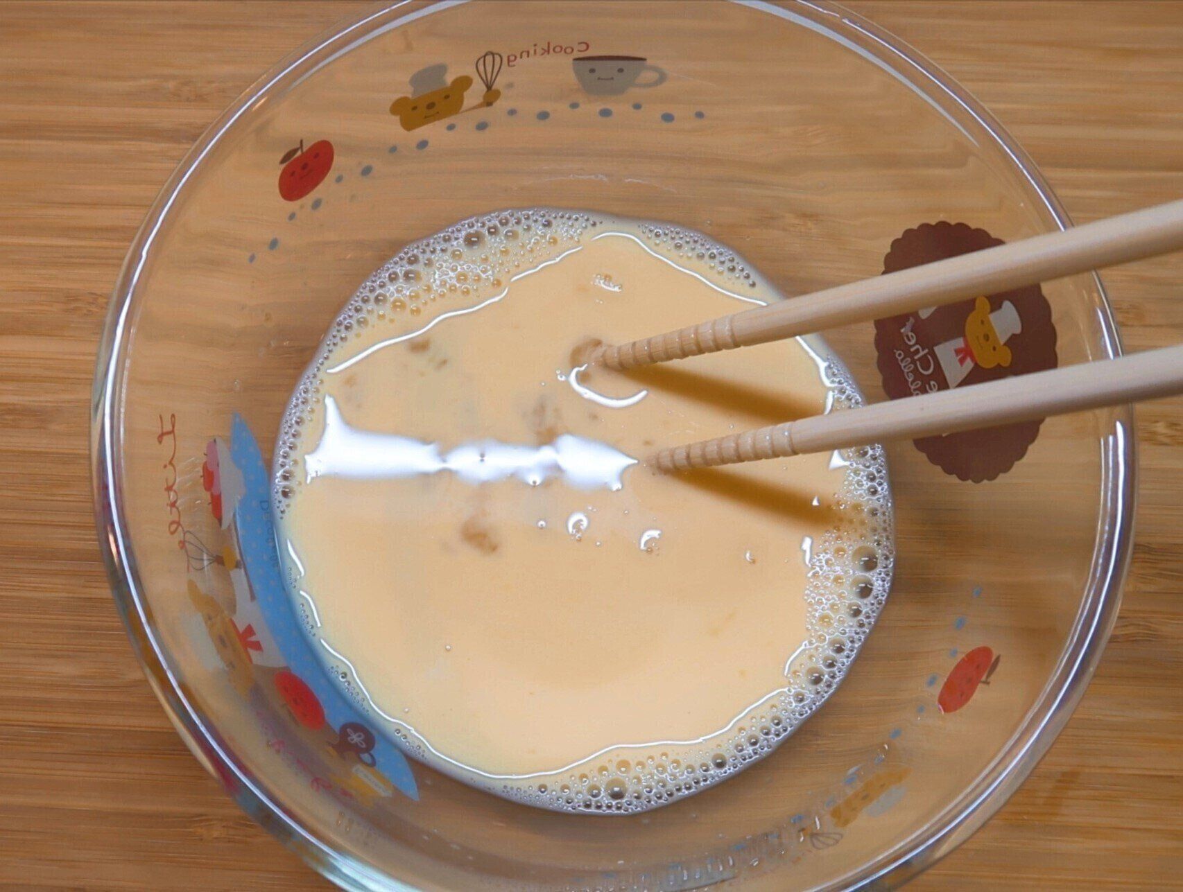 ボウルに、卵・牛乳・砂糖・塩を入れ、よく混ぜ合わせます。