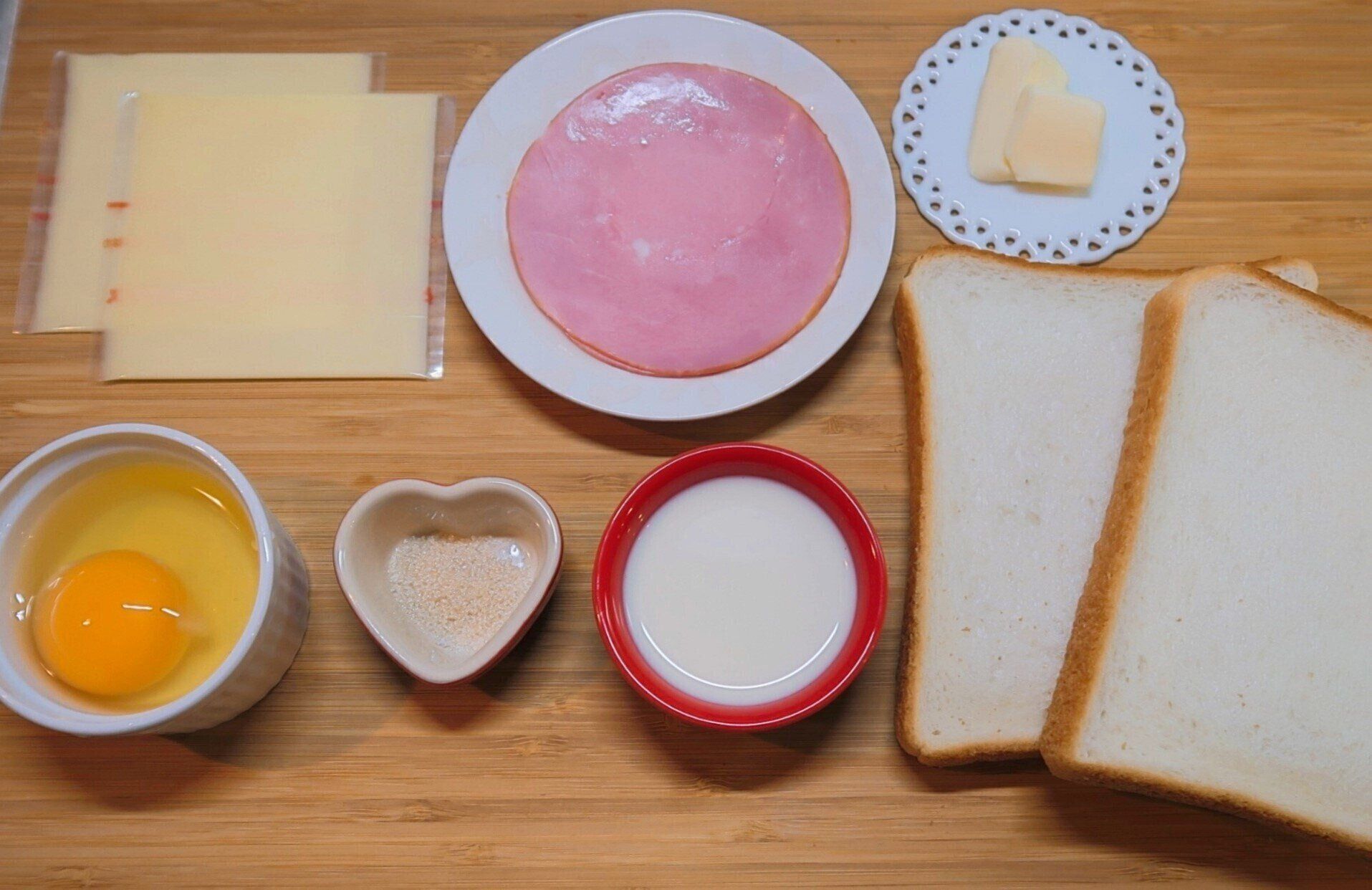 チーズ→ハム→チーズの順にのせると、きれいな断面に仕上がります。