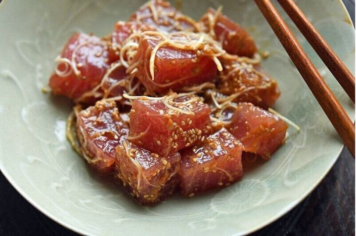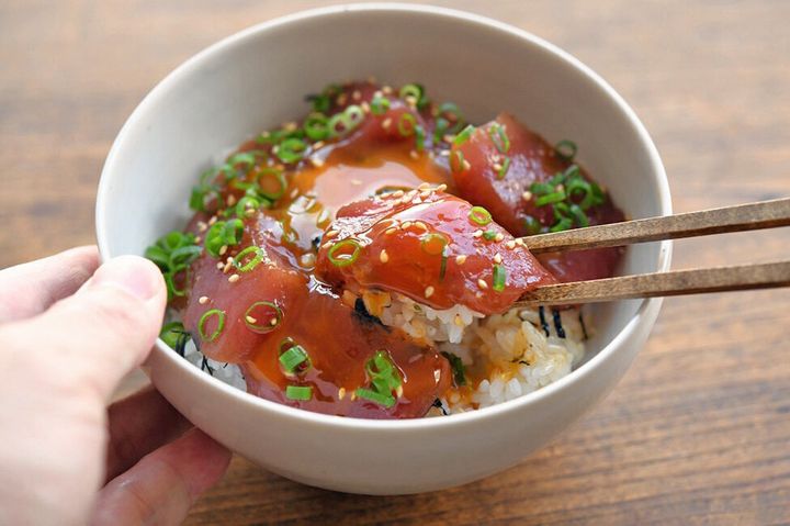 ハワイの郷土料理・アヒポキ丼が、自宅で簡単につくれるレシピ。香り高いごま油としょうゆの味つけが、マグロとよく合い食欲をそそります。具材を調味料と混ぜるだけと、火を使わず時短でつくれるのもうれしいポイントです。