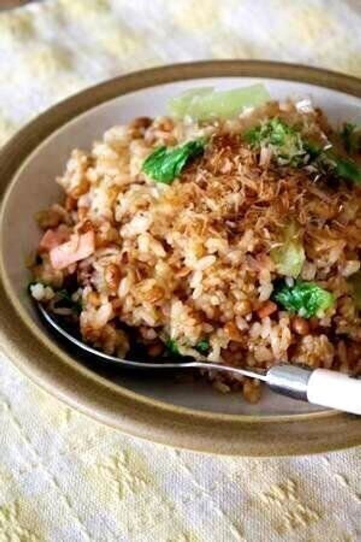 ご飯と納豆やハムなどの具材を、ごま油で香ばしく炒めたチャーハンレシピ。香りが強いごま油で炒めることで、納豆の臭みがやわらいで食べやすいですよ。焼き豚やキャベツなどを加えて、ボリューミーに仕上げるのも◎。