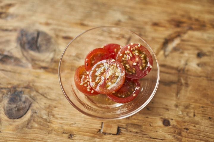 「プチトマトのゴマ和え」は、プチトマトにすり白ごま、ごま油、塩を和えたもの。お弁当のおかずにピッタリの一品です。食欲がないときにも食べやすくなっています。おつまみとしてもおすすめです。