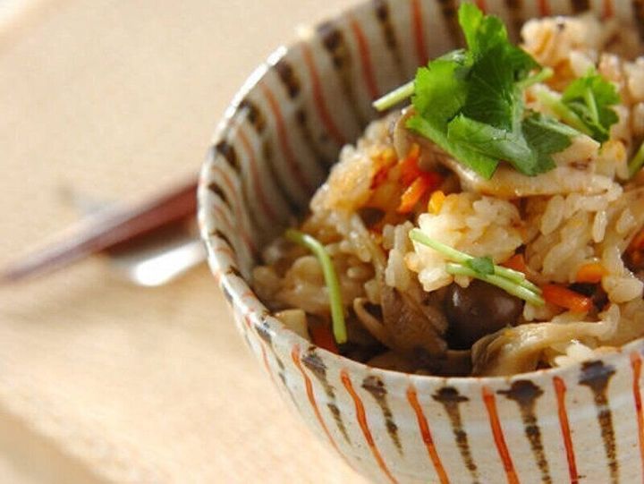 シメジやマイタケ、エリンギなど、キノコの旨味がたっぷり入った炊き込みご飯のレシピ。具材をごま油と炒めてから炊き込むので、ごま油の風味や旨味がしっかり染み込んで凝縮されています。季節感も感じられるメニューですよ。
