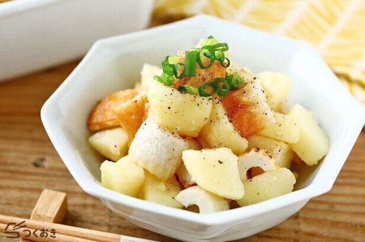 いつものポテサラに食べ飽きたら、ちくわを加えた、食感も楽しい進化形ポテサラはいかがでしょうか。ごま油がベースの味つけとなっているので、まさに食べ出したらとまらないやみつきレシピです。