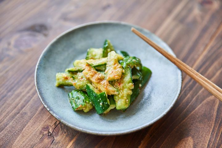 「棒きゅうり」は、きゅうりをいくらでも食べられるレシピ。水気を絞ったきゅうりをポリ袋に入れ、ごま油、酢、白いりごまなどを入れて揉みこんで完成です。おつまみとしてもおすすめ。冷蔵庫で2~3日保管できますよ。