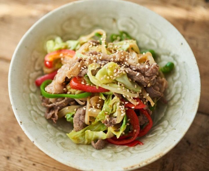 牛の切り落とし肉と、玉ねぎやキャベツなどたっぷりの野菜を使ったプルコギのレシピです。すぐにつくれて、メインのおかずやご飯のおともにも◎。彩りも豊かで食卓に映えますよ。豆板醬の少しピリッとした旨みもポイントです!