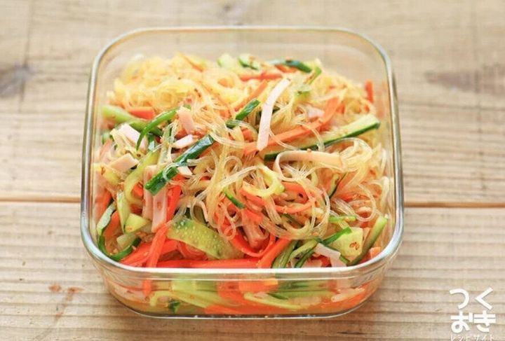 たっぷりつくって、思いきりつるつる&パクパク食べたい、さっぱりおいしい中華春雨サラダ。約10分以内で簡単につくれて、彩りも豊かでお弁当のおかずにもぴったりです!こちらは少し甘めの味つけがポイントですよ。