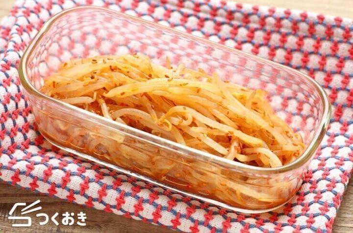 調理時間5分と時短でつくれる、ピリ辛もやしナムル。もやしのシャキシャキ感と、ごま油のうま味で箸が進みます。味が薄まらないように、もやしの水気をしっかり切ってからあえるのがポイントです。