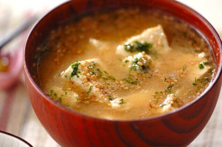 木綿豆腐を炒めてからつくる、くずし豆腐のゴマみそ汁。ぷるっとした食感を楽しめそうで、お豆腐好きにはたまらない一品です。青のりやすり白ゴマも加えて、風味豊かに仕上げます。