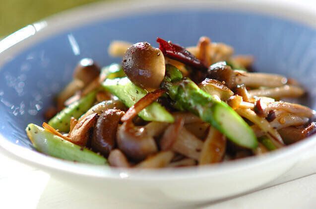 しめじやエリンギ、グリーンアスパラなどを使った炒め物のレシピ。複数のきのこを組み合わせて香りやうま味たっぷりにいただきます。洋食の副菜におすすめで、ニンニクの香りで食が進みそうな一品です。