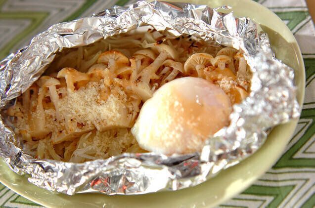 ホワイトしめじやキャベツ、とろりとした温泉卵の相性を楽しめる、ホイル焼きのレシピです。サラダのような感覚で、洋食の副菜として味わうのもおすすめですよ。