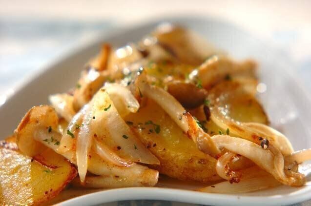 じゃがいも、玉ねぎ、しめじの、シンプルな炒めものレシピ。炒めるうちによくからむ、マヨネーズのコクとうま味がたまりません。じゃがいもは電子レンジで加熱しておけば、サッと炒めるだけで火が通るので楽ちんですよ。