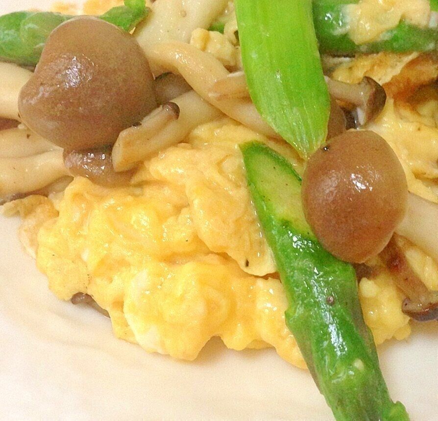 ふわふわな卵と、アスパラやしめじのシャキシャキ食感のコントラストが楽しい卵炒め。緑・黄・茶色と彩りもきれいなので、ご飯のおかずやお弁当のおかずにおすすめです。卵は空気をふくませながら、短時間で炒めるとおいしくふわふわに仕上がりますよ。
